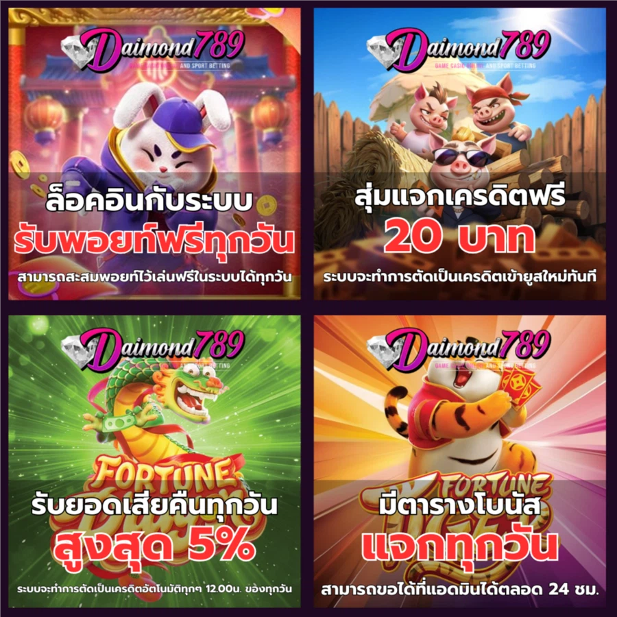 ที่สำคัญ Diamond789 มีโปรโมชั่นดีๆ มากมายให้สมาชิกได้เลือกรับ เริ่มตั้งแต่โบนัสต้อนรับสมาชิกใหม่ โบนัสเติมเงิน เครดิตฟรี และกิจกรรมแจกรางวัลอื่นๆ อีกมากมาย ทำให้มีโอกาสทำกำไรได้มากขึ้น